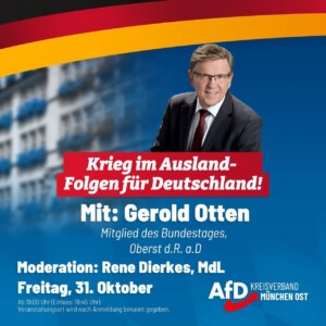 🏫 Gerold Otten, MdB und Oberst d.R. a.D. wird spannende Einblicke in die Außen- und Verteidigungspolitik der AfD- Bundestagsfraktion geben sowie aktuelle Problemlagen wie den Ukraine-Krieg und seine Außenwirkungen auf Deutschland aufzeigen. Im Anschluss folgt eine offene Diskussionsrunde.